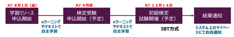 令和7年8月1日より、検定の実施に先駆け、eラーニング講座等の申込受付を開始します。検定の申込は9月頃、初級検定試験は12月14日を予定しています。